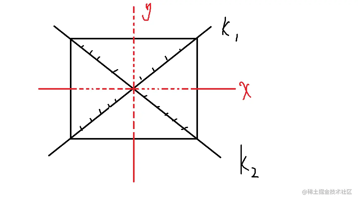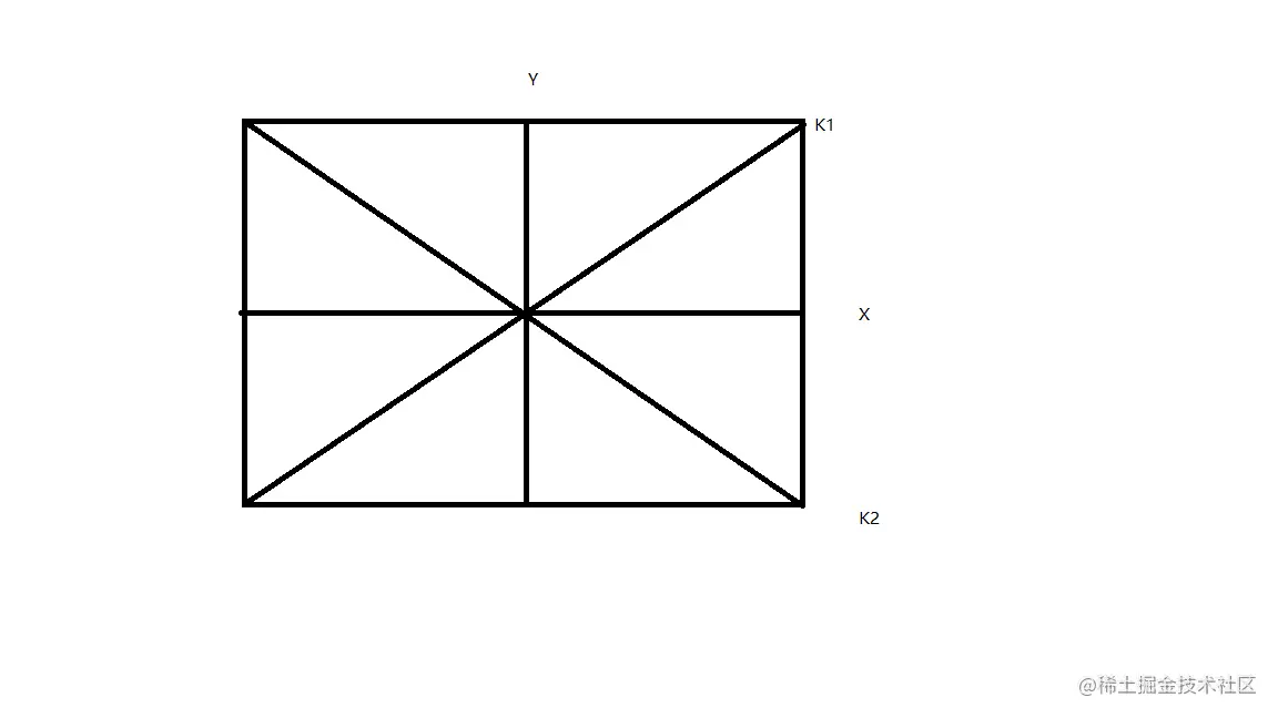 这两条对角线为K1,K2(X,Y轴只是辅助线,方便理解)。我们要在它们身上各埋10个点,每个点的距离也是一样,那么该怎么取它们的坐标点?其实也很容易,我们只有取它们 i/10屏幕宽度,i/10屏幕高度就可以了。那么K1的坐标点就是:K1 = (i/10 * 屏幕宽度,i/10 * 屏幕高度),K2也很容易,只需将K1的坐标点逆向一下就好,K2 = ((10-i)/10 * 屏幕宽度,10-i)/10 * 屏幕g高度)