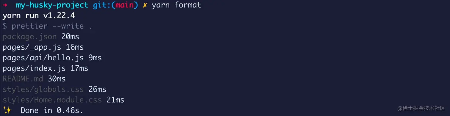 一旦运行 commit 命令,我们可以看到 Husky pre-commit hook 已经触发并格式化了我们的代码!