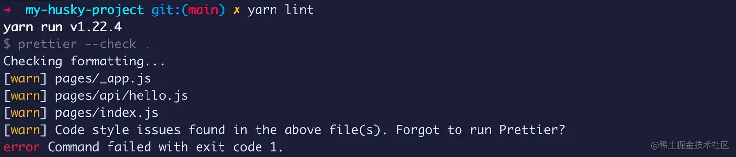 对于上面的代码,我们将其作为一个“文件格式检查”来运行,这将使我们看到哪些文件需要更改,以便符合 Prettier 的代码规范。