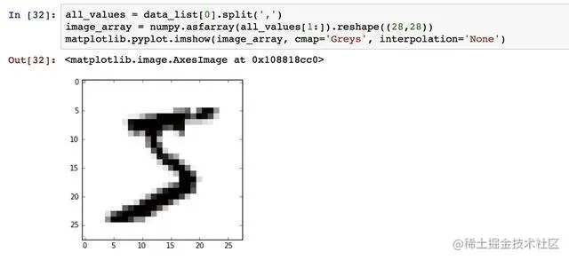 等等——将文本字符串转换为数字,这是什么意思?嗯,文件是以文本的形式读取的,每一行或每一条记录依然是文本。由逗号分割每一行得到的仍然是文本片段。文本可以是单词“apple”“orange123”或“567”。文本字符串“567”与数字567不同。因此,即使文本看起来像数字,我们也需要将文本字符串转换为数字。最后一项.reshape((28,28))可以确保数字列表每28个元素折返一次,形成28乘28的方形矩阵。所得到的28 乘28的数组名为image_array。唷!这么多事发生在一行的代码中。