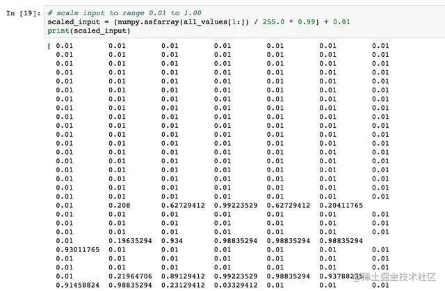 然后,需要将所得到的输入乘以0.99,把它们的范围变成0.0 到0.99。接下来,加上0.01,将这些值整体偏移到所需的范围0.01到1.00。下面的Python代码演示了这些操作: