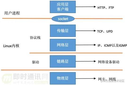 在Linux内核实现中,链路层协议靠网卡驱动来实现,内核协议栈来实现网络层和传输层。内核对更上层的应用层提供socket接口来供用户进程访问。