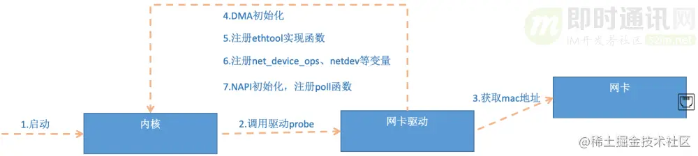 - 3)网卡驱动初始化,每个驱动都有一个初始化函数,内核会让驱动也初始化一下。在这个初始化过程中,把自己的DMA准备好,把NAPI的poll函数地址告诉内核;