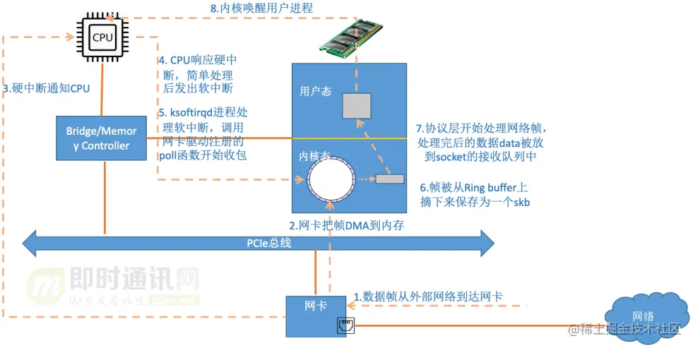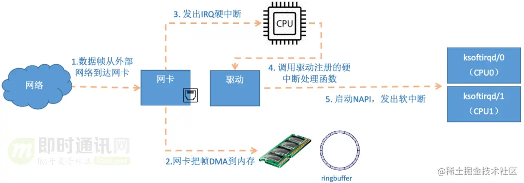 - 1)网卡将数据帧DMA到内存的RingBuffer中,然后向CPU发起中断通知;