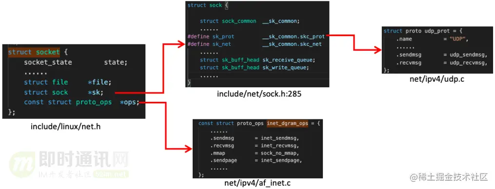 socket数据结构中的const struct proto_ops对应的是协议的方法集合。每个协议都会实现不同的方法集,对于IPv4 Internet协议族来说,每种协议都有对应的处理方法,如下。对于udp来说,是通过inet_dgram_ops来定义的,其中注册了inet_recvmsg方法。