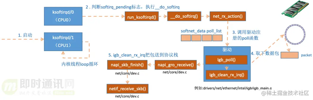 - 5)ksoftirqd线程开始调用驱动的poll函数收包;