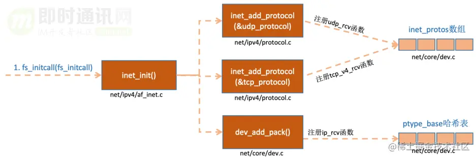 Linux内核中的fs_initcall和subsys_initcall类似,也是初始化模块的入口。fs_initcall调用inet_init后开始网络协议栈注册。通过inet_init,将这些函数注册到了inet_protos和ptype_base数据结构中了。