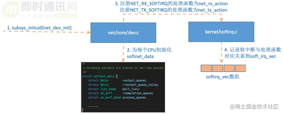 //file: net/core/dev.cstatic int __init net_dev_init(void){......for_each_possible_cpu(i) {structsoftnet_data *sd = &per_cpu(softnet_data, i);memset(sd, 0, sizeof(*sd));skb_queue_head_init(&sd->input_pkt_queue);skb_queue_head_init(&sd->process_queue);sd->completion_queue = NULL;INIT_LIST_HEAD(&sd->poll_list);......}......open_softirq(NET_TX_SOFTIRQ, net_tx_action);open_softirq(NET_RX_SOFTIRQ, net_rx_action);}subsys_initcall(net_dev_init);
