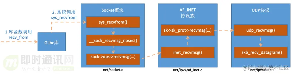 我们在代码里调用的recvfrom是一个glibc的库函数,该函数在执行后会将用户进行陷入到内核态,进入到Linux实现的系统调用sys_recvfrom。