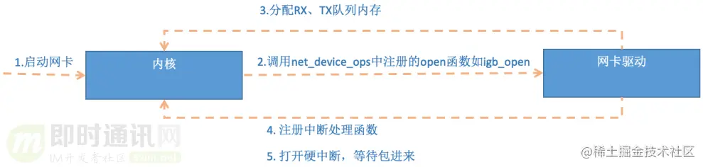 - 4)启动网卡,分配RX,TX队列,注册中断对应的处理函数。
