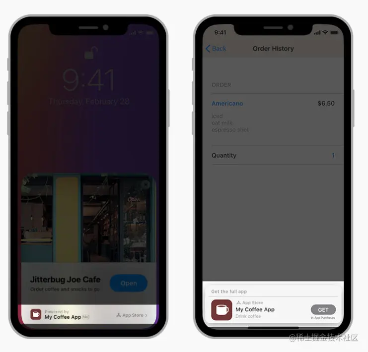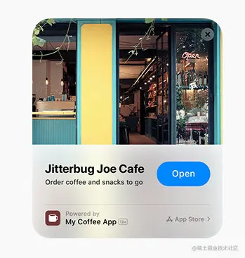 用户可以在 App Clip Card 上启动 app clip 或访问 App Store 上完整的应用程序。