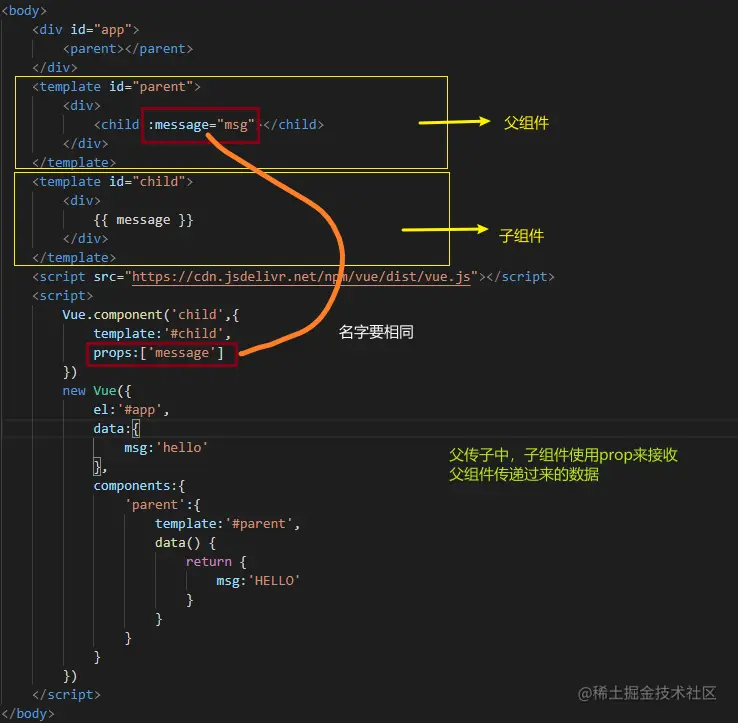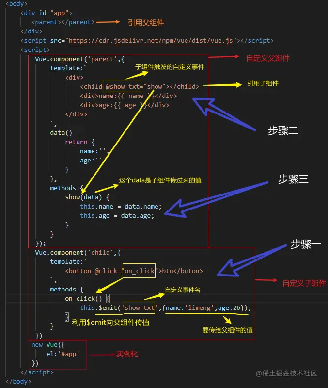 vue.js中的父传子、子传父 蛋黄不咸 2020-12-09 6,328 阅读1分钟 子传父 利用$emit 详细代码如下,有步骤标注和注释 父传子 父传子中,子组件通过props来接受父组件传递过来的数据