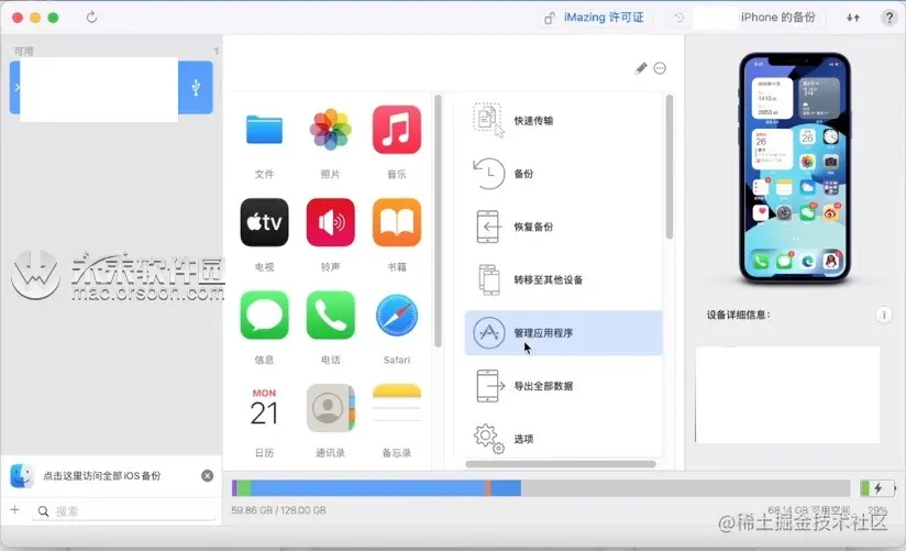 imazing mac 中文破解版是一款全面的iOS设备管理工具,功能与 iTools Pro 一样,可以让我们方便管理iOS设备的短信、联系人、照片、视频、音乐等等,方便在Mac和iOS设备间导入导出文件,支持最新的 iPhone 和 iOS 系统,小编现为您带来imazing mac 中文破解版,欢迎需要的朋友下载体验!