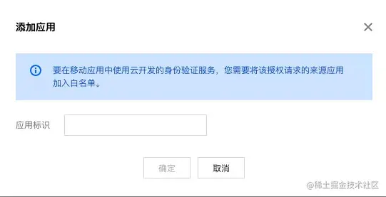 点击“添加应用”按钮,输入应用标识:uni-app(也可以输入其他有标志性的名称),需要注意应用标识必须是能够标记应用唯一性的信息,比如微信小程序的 appId 、移动应用的包名等。