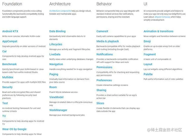 谷歌仍旧不断的完善Android Jetpack,截至到2019年8月已经有很多新加的组件并没有显示在上图中,比如CameraX等。Android Jetpack分类有4种,分别是Architecture、Foundationy、Behavior、UI,下面分别介绍下。