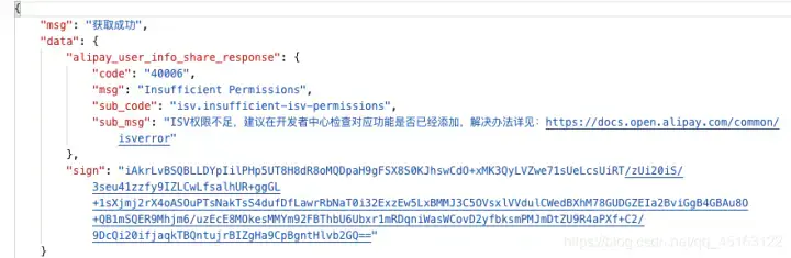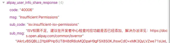 gatewayUrl = config('base.ali\_gatewayUrl'); $aop->appId = config('base.ali\_app\_id'); $aop->rsaPrivateKey = config('base.ali\_rsaPrivateKey'); $aop->alipayrsaPublicKey = config('base.ali\_alipayrsaPublicKey'); $aop->apiVersion = '1.0'; $aop->signType = 'RSA2'; $aop->postCharset='utf-8'; $aop->format='json'; $request = new \\AlipaySystemOauthTokenRequest(); $request->setGrantType("authorization\_code"); $request->setCode($param\['code'\]); //$request->setRefreshToken("201208134b203fe6c11548bcabd8da5bb087a83b"); $result = $aop->execute($request); return $result; } } 就这样就可以登录了 这里再贴出支付宝的文档[https://docs.open.alipay.com/api\_9/alipay.system.oauth.token/](https://links.jianshu.com/go?to=https%3A%2F%2Fdocs.open.alipay.com%2Fapi_9%2Falipay.system.oauth.token%2F) 不过有个问题,难道我说登录就登录了吗?程序怎么会这么听话?当然不是,既然支付宝工具调试不了,那就使用api调试工具,我这里使用Postman  使用的是post请求,把我们的地址放进去,输入code,不过好像有点问题,因为我们的code码已经过期了需要重新获取,来,重新获取一个新的code  像这个就是正确的啦,现在服务器已经获取到了access\_token这个参数,我们就要进行下一步操作了。 获取用户信息(不能再使用) 通过token接口调用支付宝会员查询接口获取会员信息 来,文档地址[https://docs.open.alipay.com/api\_2/alipay.user.info.share](https://links.jianshu.com/go?to=https%3A%2F%2Fdocs.open.alipay.com%2Fapi_2%2Falipay.user.info.share) 上面我们获取的那个access\_token是有有效期的,建议存到缓存当中 我们把程序改好了在试一次 gatewayUrl = config('base.ali\_gatewayUrl'); $aop->appId = config('base.ali\_app\_id'); $aop->rsaPrivateKey = config('base.ali\_rsaPrivateKey'); $aop->alipayrsaPublicKey = config('base.ali\_alipayrsaPublicKey'); $aop->apiVersion = '1.0'; $aop->signType = 'RSA2'; $aop->postCharset='utf-8'; $aop->format='json'; $request = new \\AlipaySystemOauthTokenRequest(); $request->setGrantType("authorization\_code"); $request->setCode($param\['code'\]); //$request->setRefreshToken("201208134b203fe6c11548bcabd8da5bb087a83b"); $result = $aop->execute($request); //return $result; $responseNode = str\_replace(".", "\_", $request->getApiMethodName()) . "\_response"; $accessToken= $result->$responseNode->access\_token; return self::getUserInfoAli($accessToken); } /\*\* \* 获取支付宝用户信息 \* @param $accessToken \* @return bool|mixed|\\SimpleXMLElement \* @throws \\Exception \*/ public static function getUserInfoAli($accessToken){ $aop = new \\AopClient (); $aop->gatewayUrl = config('base.ali\_gatewayUrl'); $aop->appId = config('base.ali\_app\_id'); $aop->rsaPrivateKey = config('base.ali\_rsaPrivateKey'); $aop->alipayrsaPublicKey = config('base.ali\_alipayrsaPublicKey'); $aop->apiVersion = '1.0'; $aop->signType = 'RSA2'; $aop->postCharset='utf-8'; $aop->format='json'; $request = new \\AlipayUserInfoShareRequest (); $result = $aop->execute ( $request , $accessToken ); return $result; } } 提醒一下,这里code只能使用一次,使用一次之后就会失效 程序写好之后调用发现了一个惊喜,好吧,坑还是有的,按照他的来  提升开发权限 找到我们的小程序  一步一步来  调用,然后再次出错,陷入一阵。。。。。  获取用户信息改变 好吧既然如此,就上官网查看 它居然说不能使用了 通过前台调用用户接口 my.getOpenUserInfo[https://opendocs.alipay.com/mini/api/ch8chh](https://links.jianshu.com/go?to=https%3A%2F%2Fopendocs.alipay.com%2Fmini%2Fapi%2Fch8chh) 现在换一种思路,在小程序端查询信息存入到数据库中, 改了一下代码,我在这里贴出来 var app = getApp() Page({ data: { hasUserInfo: false }, getUserInfo() { my.getAuthCode({ scopes: 'auth\_user', fail: (error) => { console.error('getAuthCode', error); }, success: (res) => { let code = res.authCode; my.request({ url: 'https://www.guizimo.top/demo/public/index.php/api/v1/getcodeali', method: 'POST', data:{ code:code }, }); my.getAuthUserInfo({ fail: (error) => { console.error('getAuthUserInfo', error); }, success: (userInfo) => { console.log(\`userInfo:\`, userInfo); this.setData({ userInfo, hasUserInfo: true, }); my.request({ url: 'https://www.guizimo.top/demo/public/index.php/api/v1/setuserinfoali', method: 'POST', data:{ avatar:userInfo.avatar, nickName:userInfo.nickName }, success: (result) => { console.log(result); my.alert({ content: '登录成功', }); } }); } }); } }); }, clear() { this.setData({ hasUserInfo: false, userInfo: {} }) } }) 后台主要是存入信息,用了两个接口我把实现的方法写在下面 gatewayUrl = config('base.ali\_gatewayUrl'); $aop->appId = config('base.ali\_app\_id'); $aop->rsaPrivateKey = config('base.ali\_rsaPrivateKey'); $aop->alipayrsaPublicKey = config('base.ali\_alipayrsaPublicKey'); $aop->apiVersion = '1.0'; $aop->signType = 'RSA2'; $aop->postCharset='utf-8'; $aop->format='json'; $request = new \\AlipaySystemOauthTokenRequest(); $request->setGrantType("authorization\_code"); $request->setCode($param\['code'\]); //$request->setRefreshToken("201208134b203fe6c11548bcabd8da5bb087a83b"); $result = $aop->execute($request); //return $result; $responseNode = str\_replace(".", "\_", $request->getApiMethodName()) . "\_response"; //$accessToken= $result->$responseNode->access\_token; $userid = $result->$responseNode->user\_id; //return $userid; return self::saveUserId($userid); } /\*\* \* 保存UserID到数据库 \* @param $userid \* @return bool \* @throws \\think\\db\\exception\\DataNotFoundException \* @throws \\think\\db\\exception\\ModelNotFoundException \* @throws \\think\\exception\\DbException \*/ public static function saveUserId($userid){ $res = UserAli::where('userid',$userid)->find(); if($res){ $Uid = $res\['id'\]; }else{ $Uid = Db::name('user\_ali')->insertGetId(\['userid'=>$userid\]); } $result = Cache::set('Uid',$Uid); return $result; 