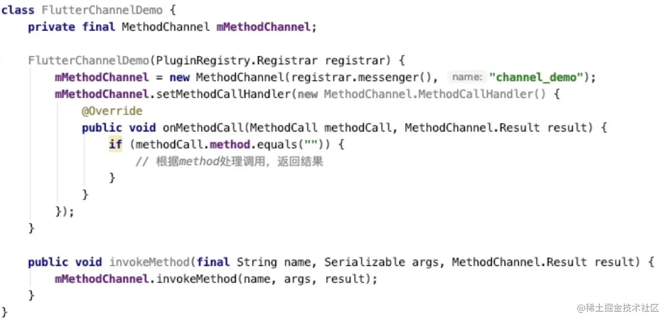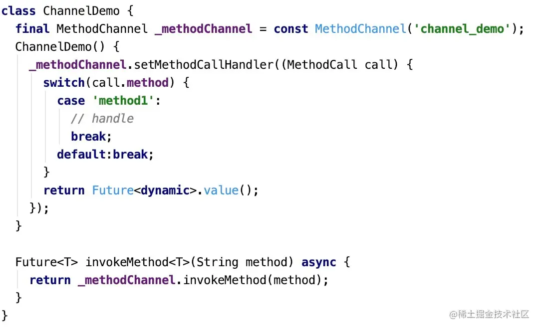 目前我们的混合开发只进行了页面级别的实践,一次展示一个完整的Flutter页面,不存在原生页view和Flutter view在同一页面混合展示的情况。原生和Flutter之间只需要支持页面跳转,没有大量的数据传输要求。基于此我们只采用了MethodChannel进行通信。代码如下: