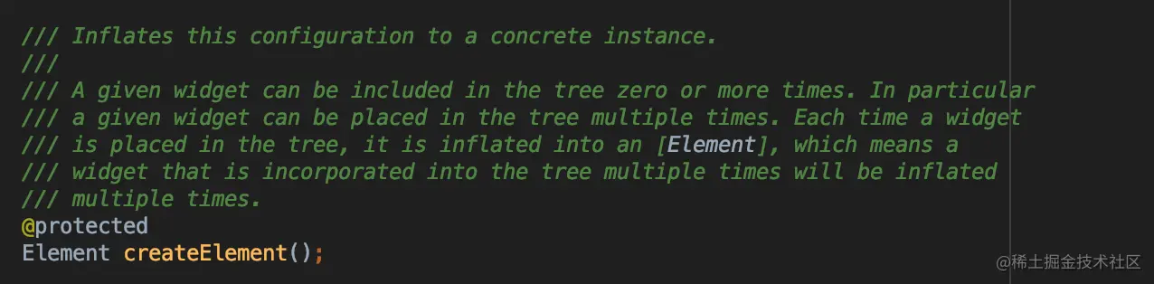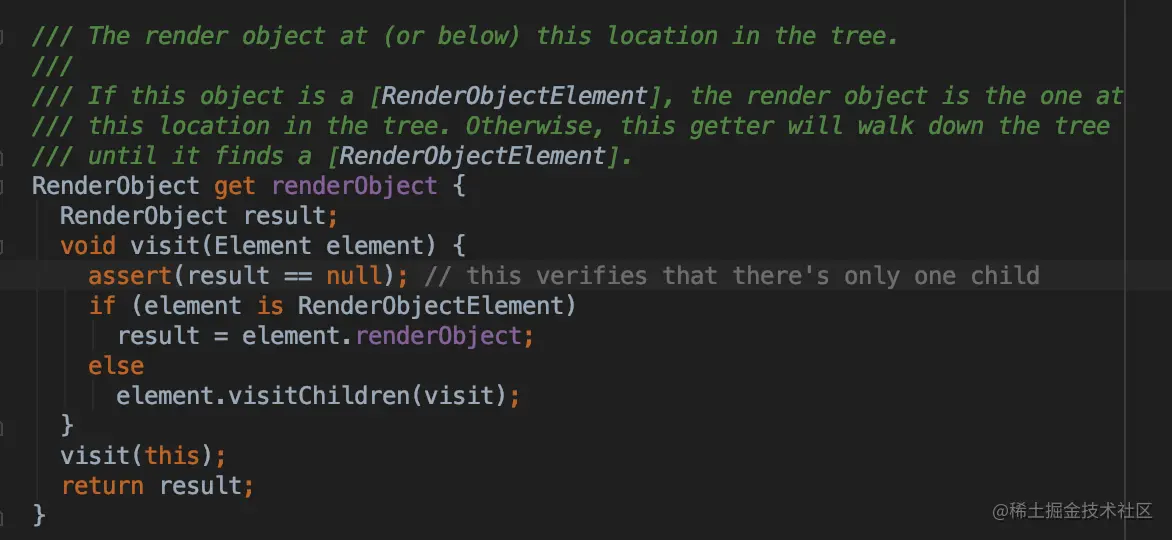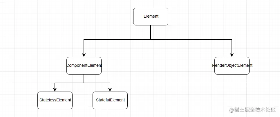 Widget初始化时会通过createElement创建Element,Element持有Widget和RenderObject。下图代码简要描述了Element与RenderObject的关系: