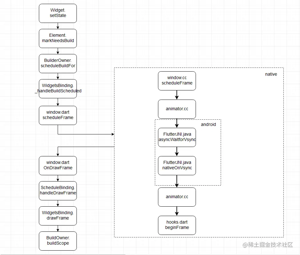 dart层将ElementTree中的element标记为dirty,然后通知引擎需要刷新页面,引擎通过jni去监听原生系统的垂直信号(Vsync),当下一个垂直信号到来时,引擎通知dart层更新ui树合成scene数据并取消dirty标记,引擎拿到scene数据后执行光栅化及帧合成,然后将帧数据渲染上屏。