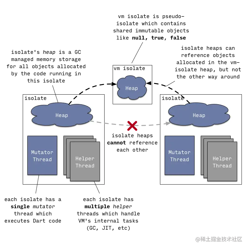 而dart程序的并发则需要依赖多个isolate来实现。每个isolate创建时都会为其分配一条mutator线程用于运行dart代码。