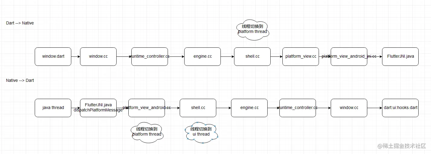 channel中dart端逻辑始终在ui thread执行,而channel中原生侧逻辑始终运行在platform thread。
