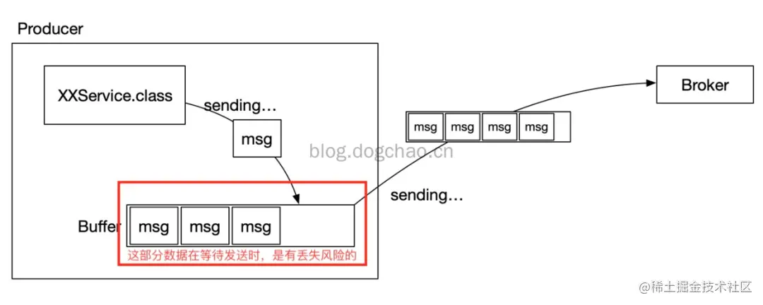但是,buffer中的数据就是危险的。在正常情况下,客户端的异步调用可以通过callback来处理消息发送失败或者超时的情况,但是,一旦producer被非法的停止了,那么buffer中的数据将丢失,broker将无法收到该部分数据。又或者,当Producer客户端内存不够时,如果采取的策略是丢弃消息(另一种策略是block阻塞),消息也会被丢失。抑或,消息产生(异步产生)过快,导致挂起线程过多,内存不足,导致程序崩溃,消息丢失。