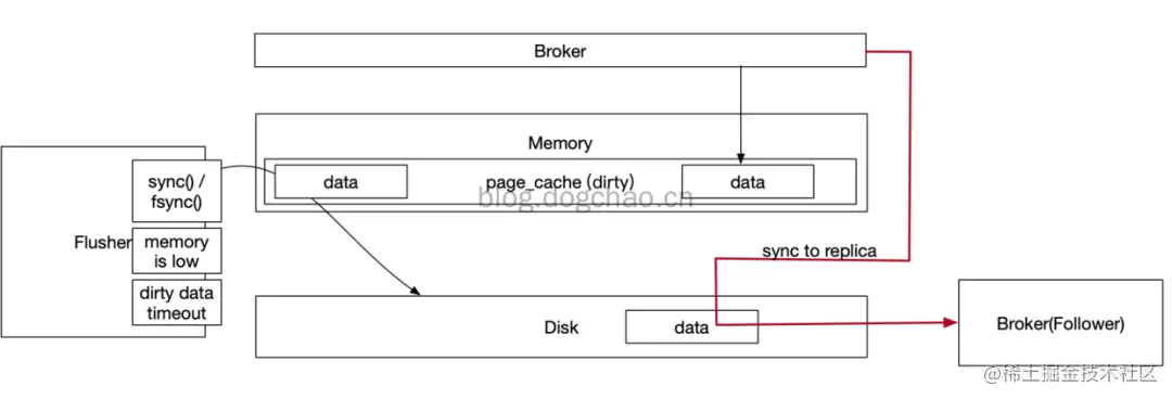 上图简述了broker写数据以及同步的一个过程。broker写数据只写到PageCache中,而pageCache位于内存。这部分数据在断电后是会丢失的。pageCache的数据通过linux的flusher程序进行刷盘。刷盘触发条件有三: