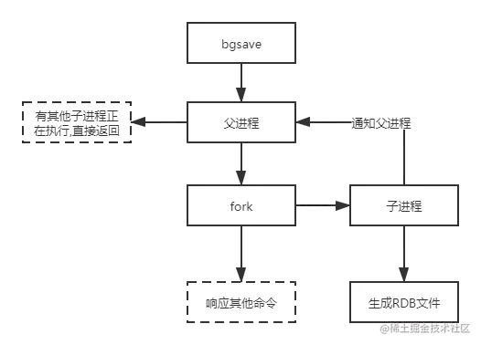 RDB没有办法做到实时持久化(秒级),bgsave每次运行执行fork创建子进程,属于重量级操作,频繁执行成本高。流程如下: