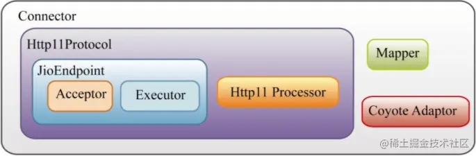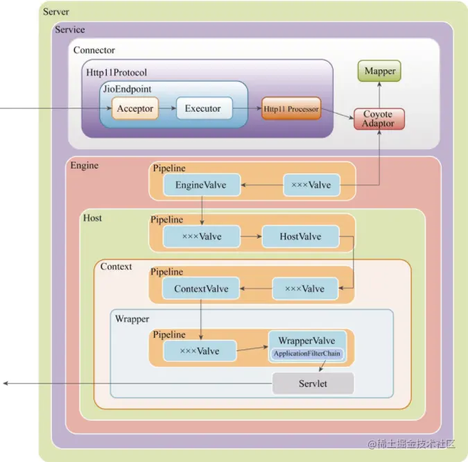⑤ CoyoteAdaptor组件负责将Connector组件和Engine容器连接起来,把前面处理过程中生成的请求对象Request和响应对象Response传递到Engine容器,调用它的管道。