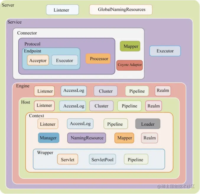 在Server的整个生命周期中,不同阶段会有不同的事情要完成。为了方便扩展,它引入了监听器方式,所以它也包含了Listener组件。另外,为了方便在Tomcat中集成JNDI,引入GlobalNamingResources组件。