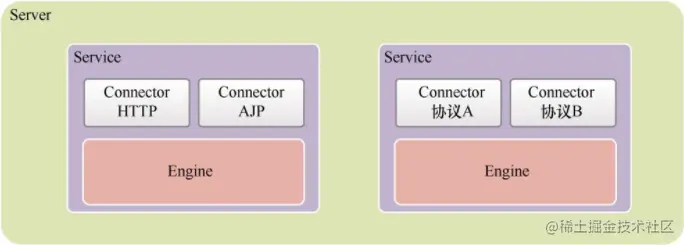 若干Connector组件和一个客户端请求处理组件Engine组成的集合即为Service。