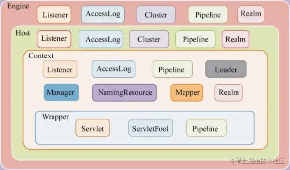 Container包括4个级别的容器:Engine组件、Host组件、Context组件和Wrapper组件