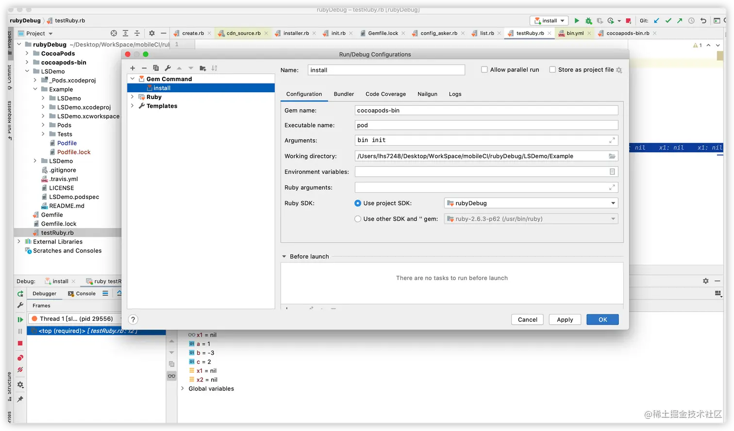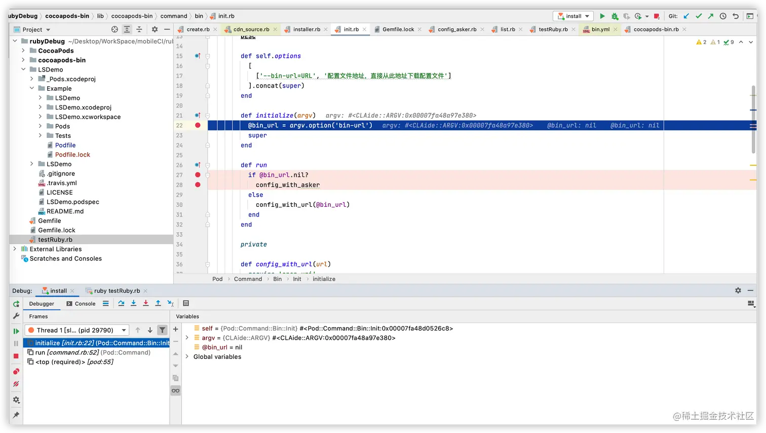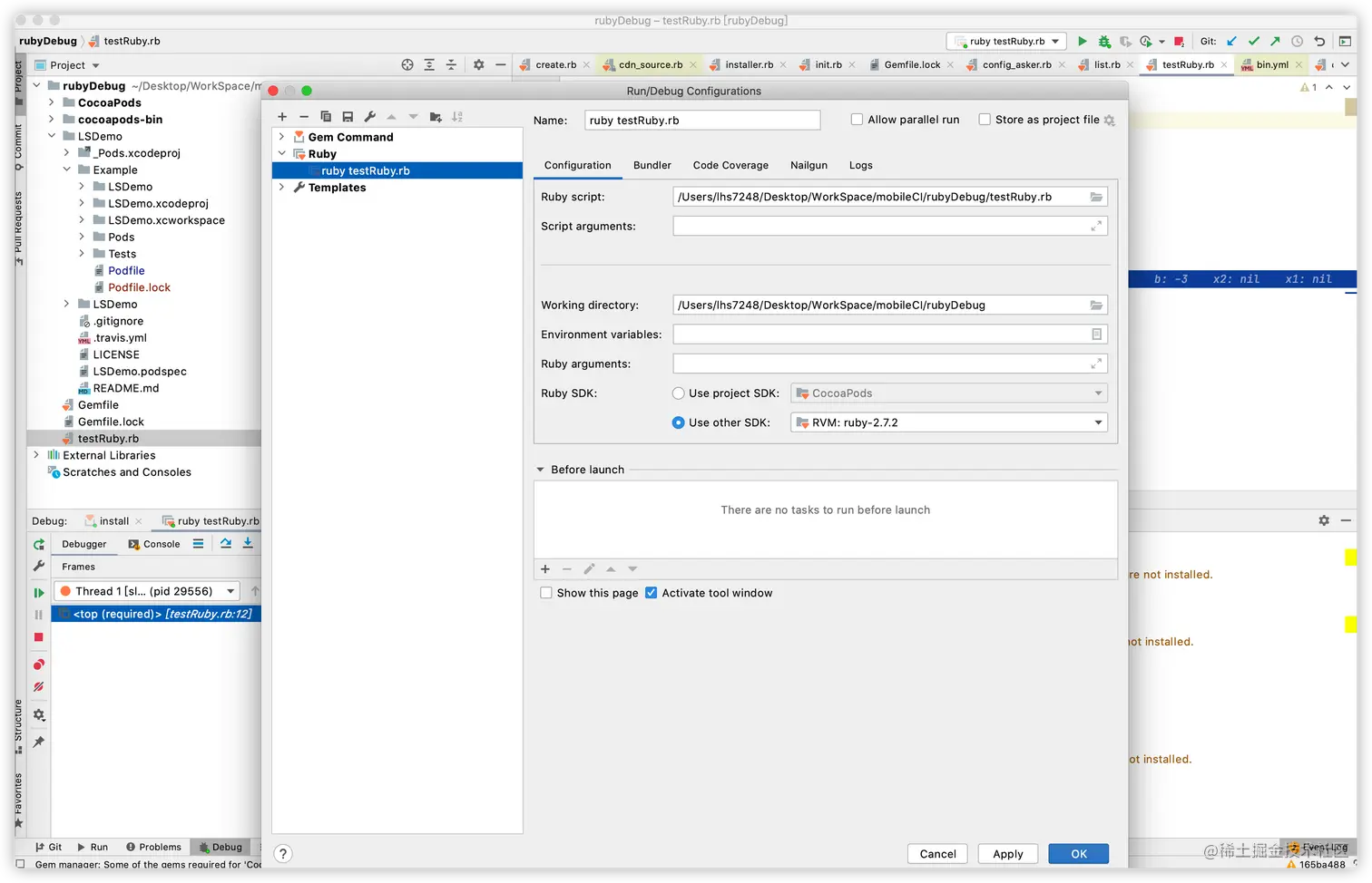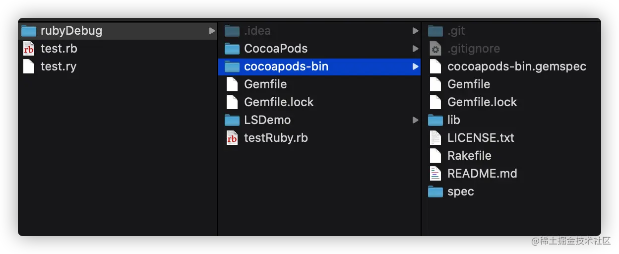 1. 创建文件目录: rubyDebug 2. clone CocoaPods 对应的源码仓库:git clone https://github.com/CocoaPods/CocoaPods.git 3. clone cocoapods-bin 对应的源码仓库:git clone https://github.com/tripleCC/cocoapods-bin.git -