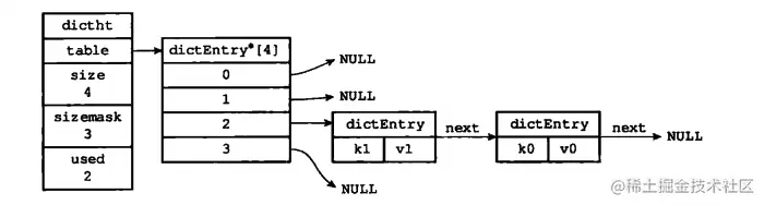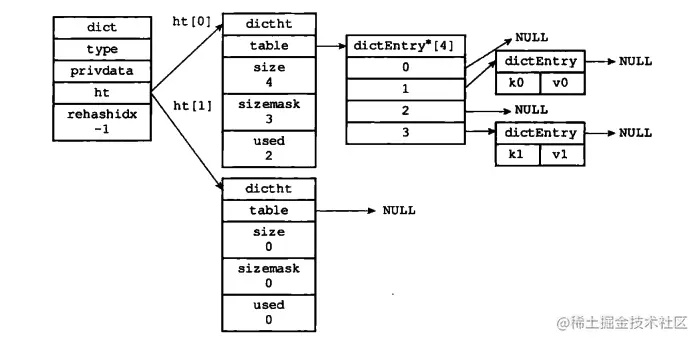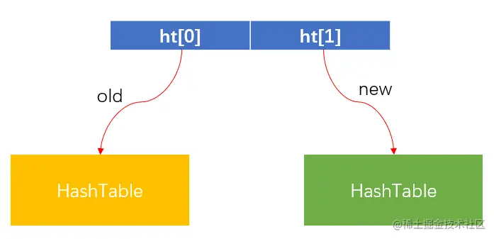 字典类型的中其实包含两个哈希表,一个是我们刚刚讲到用于存储(K,V)的哈希表ht[0],而另外一个ht[1]用于后续的扩容。