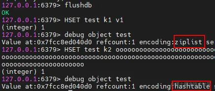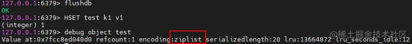 可以看到,当前test中只包含一个键值对,此时整个字典使用压缩列表来实现的。压缩列表会在内存中申请一块连续的内存空间