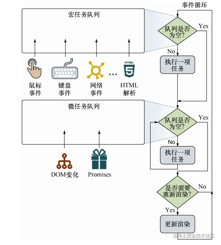 - 宏任务:包括创建主文档对象、解析 HTML、执行主线(或全局)JavaScript 代码,更改当前 URL 以及各种事件,如页面加载、输入、网络事件和定时器事件。