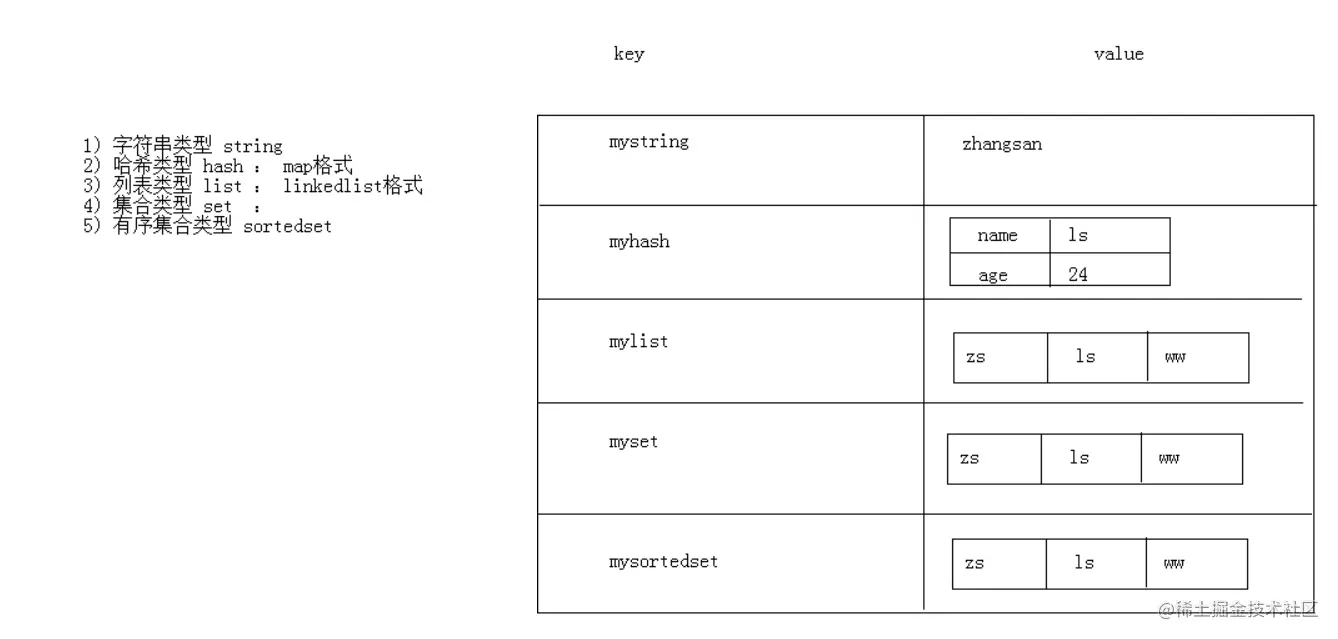 Redis是用C语言开发的一个开源的高性能键值对(key-value)数据库,官方提供测试数据,50个并发执行100000个请求,读的速度是110000次/s,写的速度是81000次/s ,且Redis通过提供多种键值数据类型来适应不同场景下的存储需求,目前为止Redis支持的键值数据类型如下: