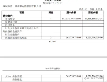[[['项目', '附注', '期末余额', '期初余额'], ['流动资产:', '', '', ''], ['货币资金', '1', '112,074,791,420.06', '87,868,869,913.34'], ['结算备付金', '', '', ''], ['拆出资金', '', '', ''], ['以公允价值计量且其变动计入当\n期损益的金融资产', '', '', ''], ['衍生金融资产', '', '', ''], ['应收票据及应收账款', '2', '563,739,710.00', '1,221,706,039.00']]]