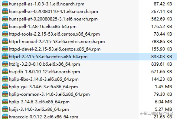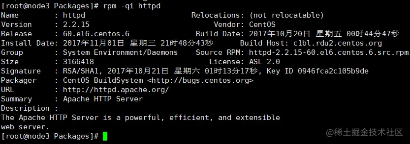 范例:以安装 httpd-2.2.15-53.el6.centos.x86_64.rpm 为例: