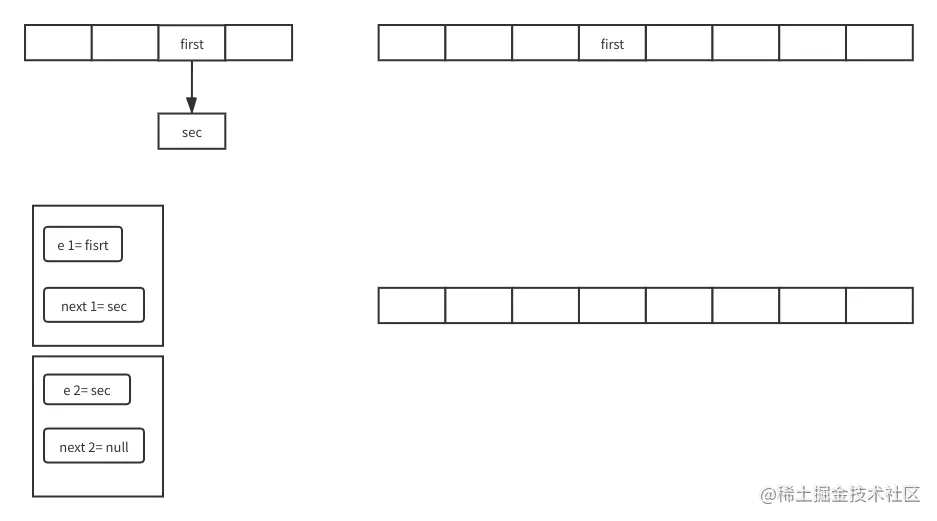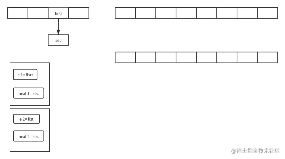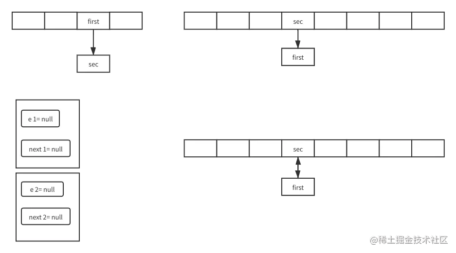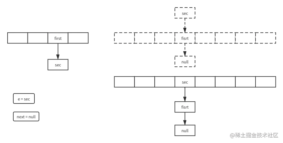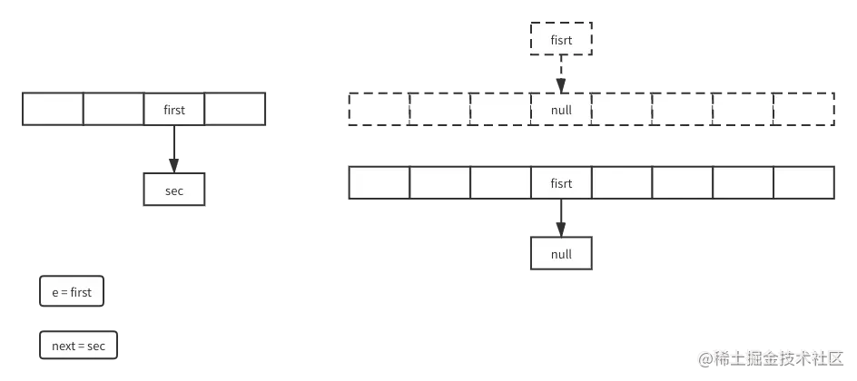 现在新数组就变成图中右下的样子了,可以看到就是sec的next变成first,first的next为空比起原先数组的关系就是反过来的。因为头插嘛第一个先插过去后面的插过去就更靠前第一个就是最下面。接下来e就是sec的next也就是遍历到第三个了然后没有下一个while结束,for循环下一个数组元素。就这样循环往复遍历所有的元素转移到新数组。