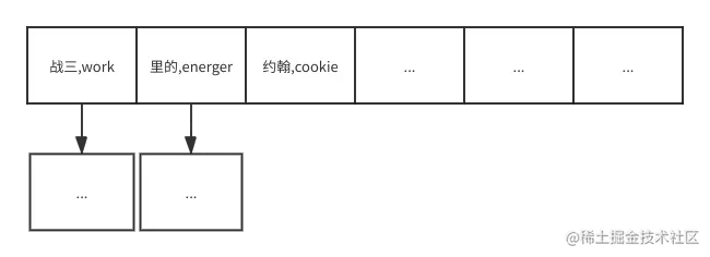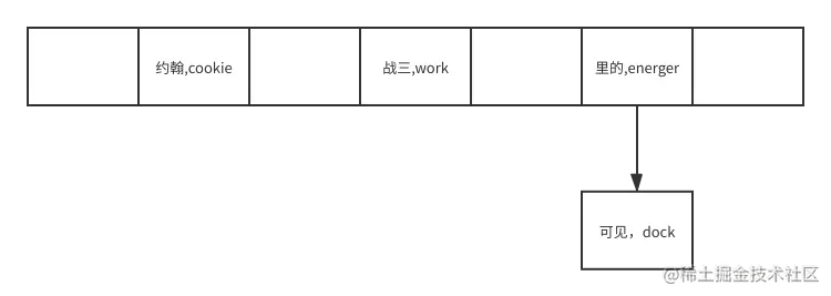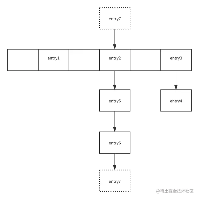 那么在这里所谓的链表就是在逻辑上理解为它们在数组同一个位置,实际上就是先找到数组的这个位置得到了一个entry1然后这个entry1里的next属性引用的就是一个entry2,通过这个entry2的next就能找到entry3。这样的一个链表,基于找到第一个(数组中的entry)然后通过next字段一个一个的引用。下图与上图相对应