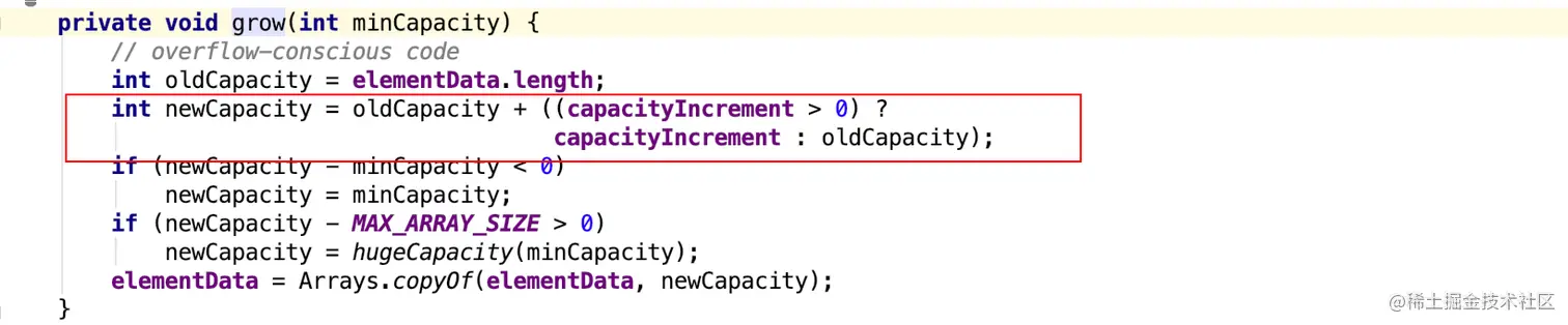 注意方法第二行的位运算,算术右移一位,相当于除以2,因此整行代码计算出的新容量,会是旧容量的1.5倍
