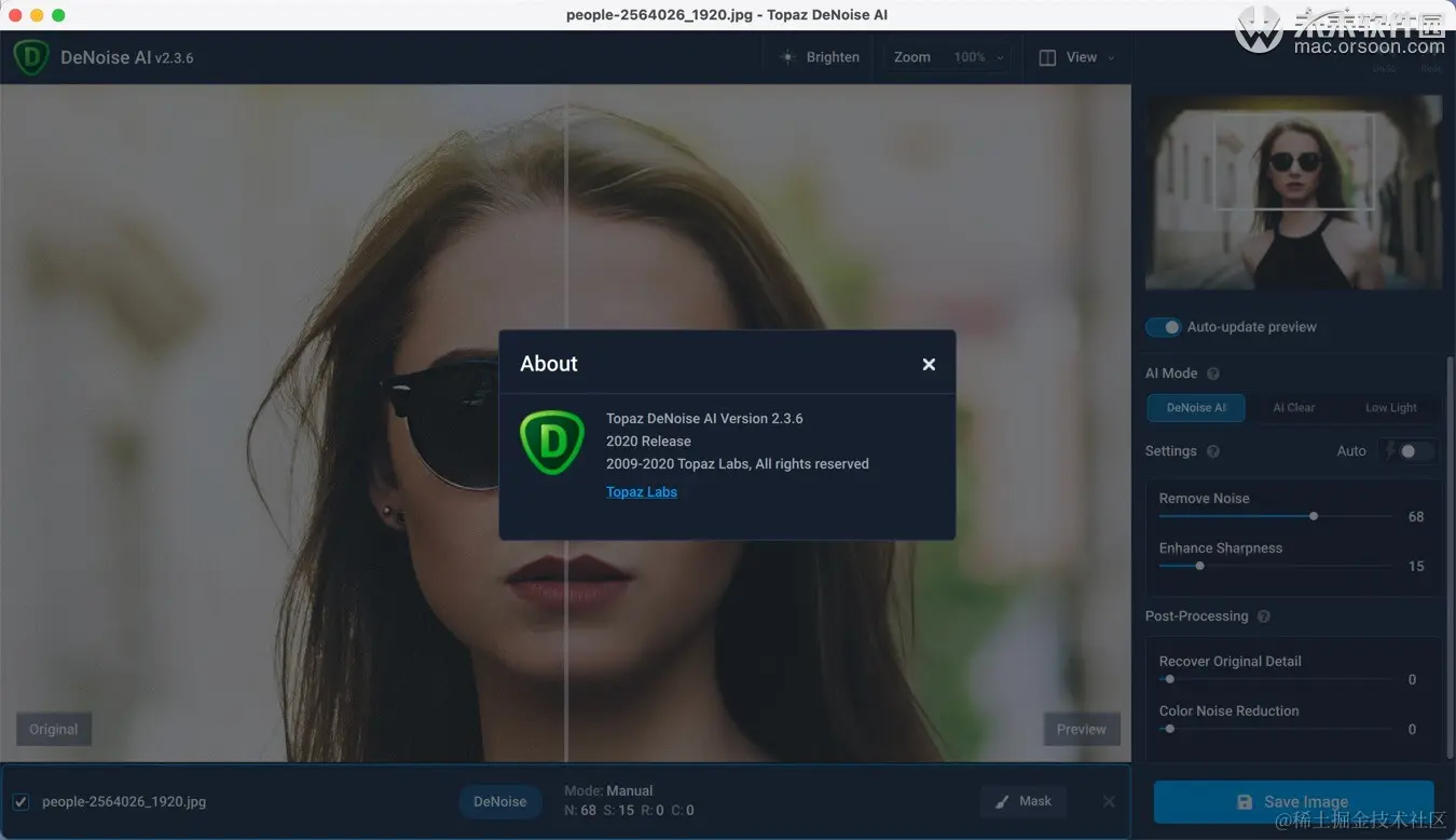TopazDeNoise AI for mac是Topaz系列中的一款AI图像降噪软件,topaz denoise ai提供了数百万个噪声/清晰图像的算法,可以快速消除图像中噪音并且保留原始图像细节,人工智能降噪Topaz DeNoise AI能够很好的帮助用户处理图像,这里准备了最新版本的Topaz DeNoise AI破解版下载,欢迎各位来体验哦!