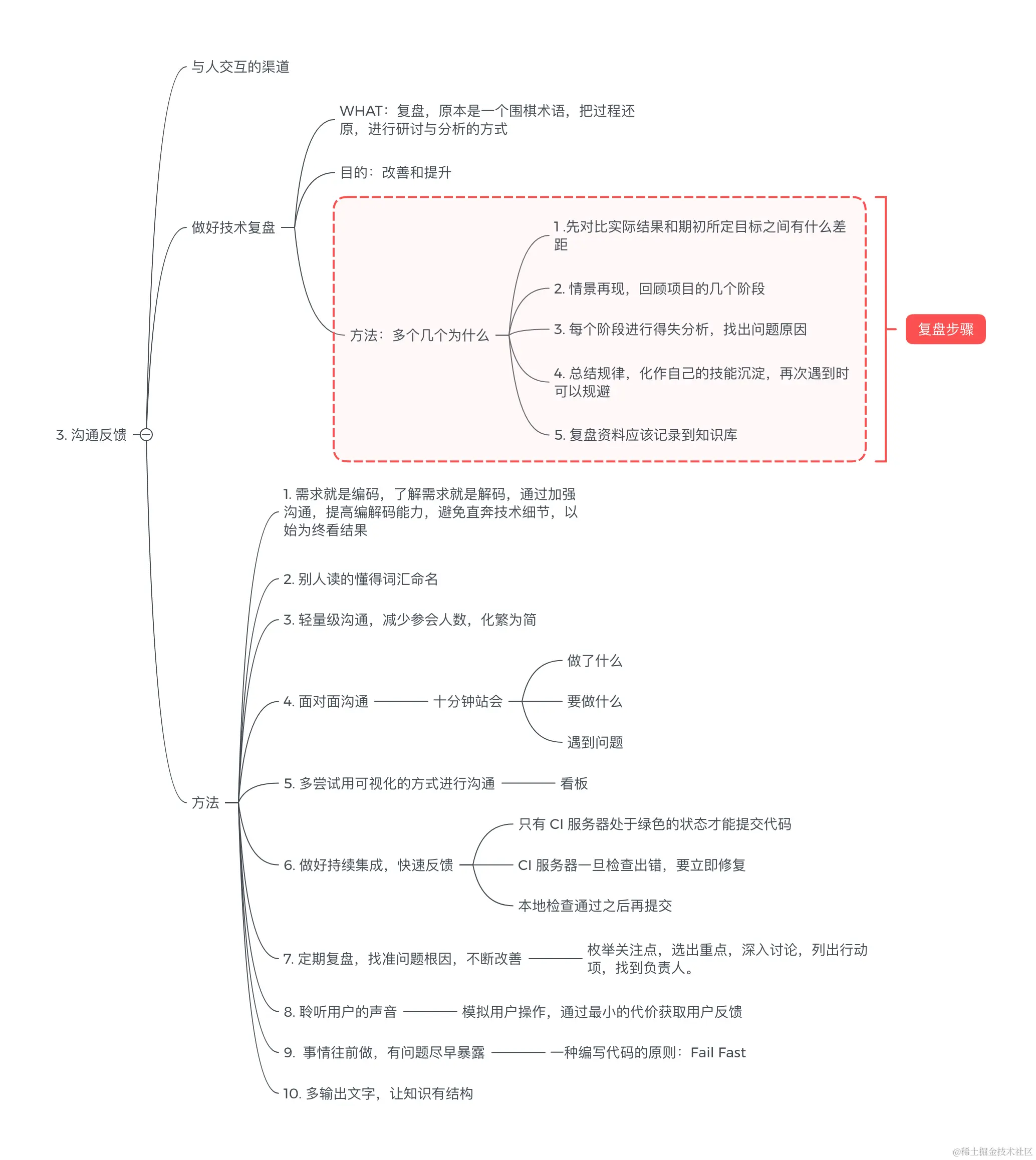 - 进行多沟通,能够面对面尽量面对面沟通,定期复盘减少阻塞,遇到问题提前反馈,Fast Fail原则。