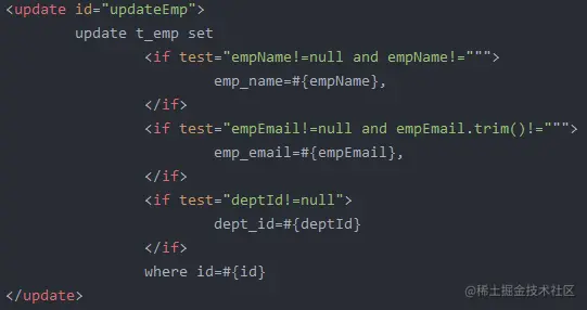 当在 update 语句中使用if标签时,如果前面的if没有执行,则或导致逗号多余错误。使用set标签可以将动态的配置 SET 关键字,并剔除追加到条件末尾的任何不相关的逗号。使用 if+set 标签修改后,如果某项为 null 则不进行更新,而是保持数据库原值。