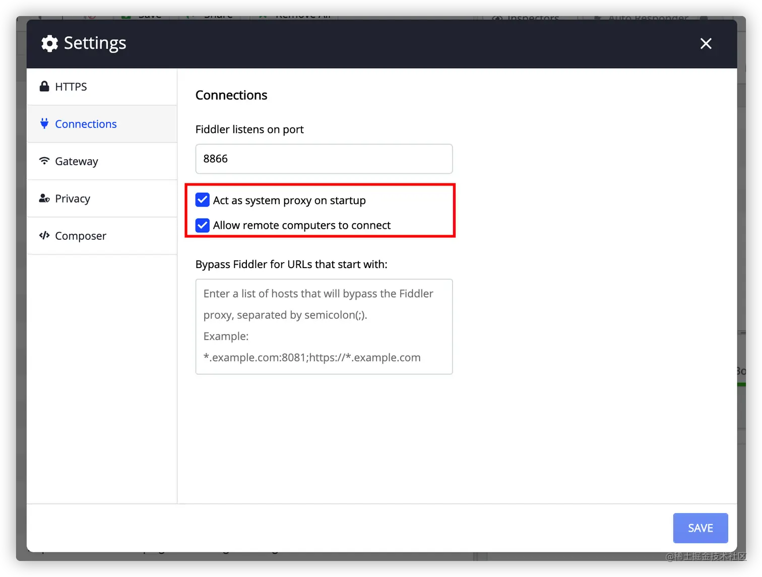 勾选 Act as system proxy on startup 勾选 Allow remote computers to connect