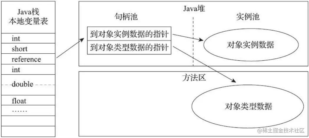 - 通过句柄访问(reference 中存储的是稳定的句柄地址,在对象被移动的时候只会改变句柄中的实例数据指针,而 reference 本身不需要被修改)