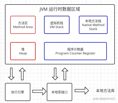 Java 虚拟机在执行 Java 程序的过程中会把它所管理的内存划分为五个不同的数据区域(如图所示)。