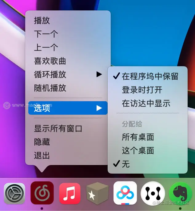 丨对于同款 App 的窗口,你可以在程序坞中选择该应用,并在右键菜单中将该 App 窗口分配给指定桌面或者所有桌面。