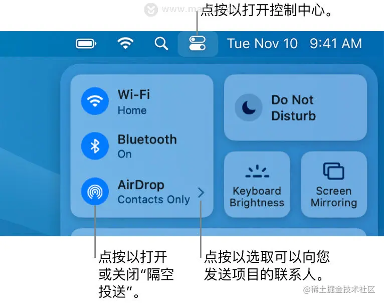 你可以在访达边栏或者文件右键菜单栏的分享列表中使用「隔空投送」,如果你的系统是 macOS Big Sur,也可以直接在菜单栏的控制中心内直接管理隔空投送。